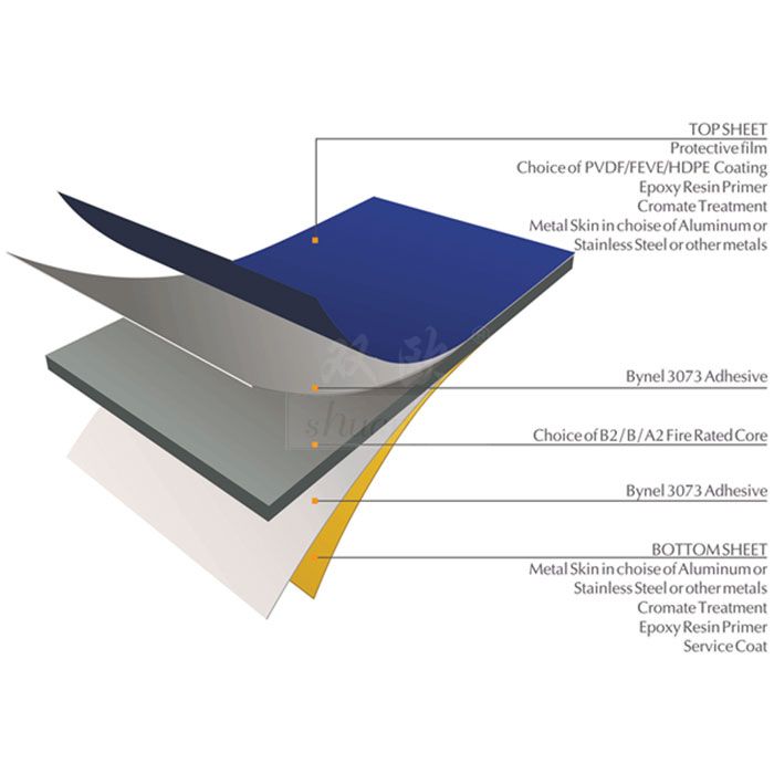 雙歐氟碳鋁塑板原料鋁皮材料:高強度鋁合金1系列或3系列板材塑料芯:無毒低密度聚乙烯(LDPE)芯表面油漆:高性能氟碳涂層雙歐氟碳鋁塑板規范寬度:1220mm、1250mm、1500mm。長度:可根據客戶需要,甚至可達10米以上(可根據運輸材料大小和工